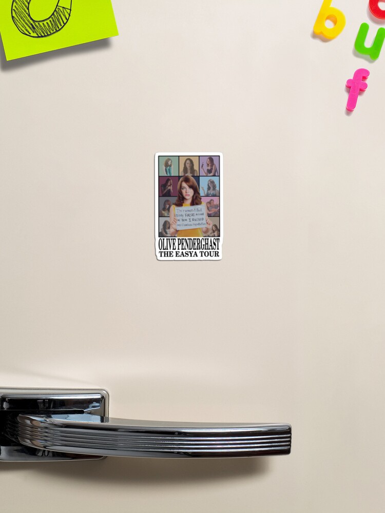 Features Emma Stone as Olive Penderghast in Easy A in a variety of poses, in the style of Taylor Swift’s Eras Tour poster.